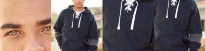 - Contrast jersey lined hood with sewn eyelets and matching drawcord